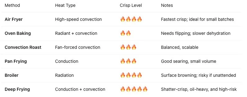 Tofu crisping succeeds when moisture is rapidly removed and the surface reaches 140–180°C. Each cooking method delivers heat differently: